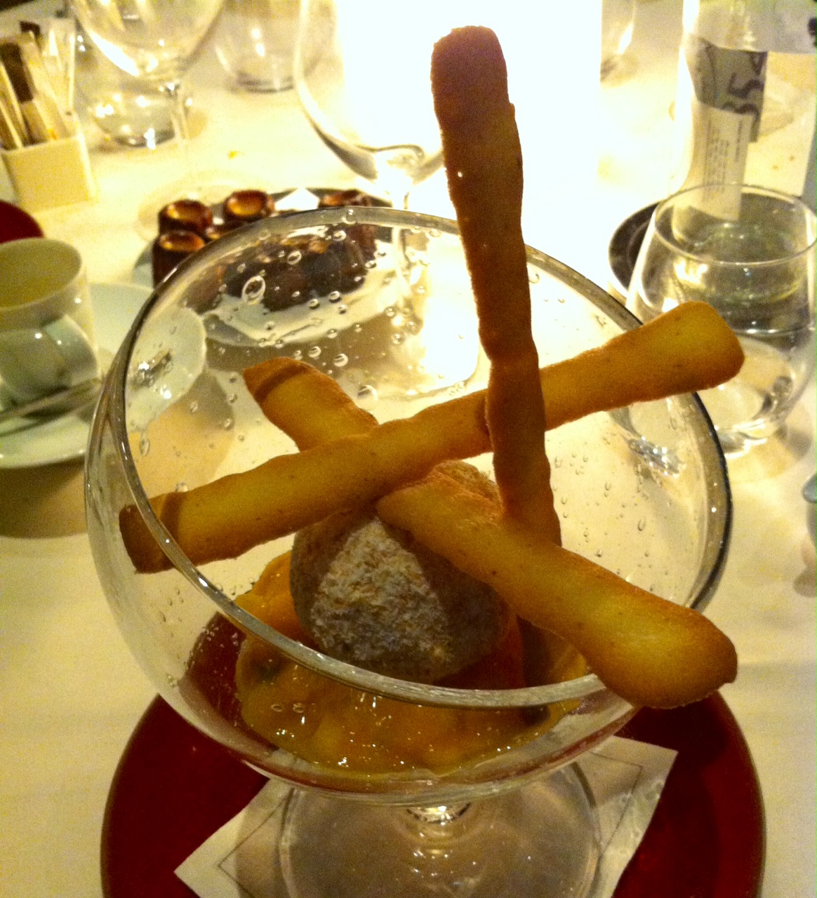 Le dîner s’est achevé sur un Parfait glacé coco/passion, biscuit au gingembre, graphique, avec un contraste de saveurs intéressant et très maîtrisé entre la douceur de la coco et l’acidulé du maracuja.