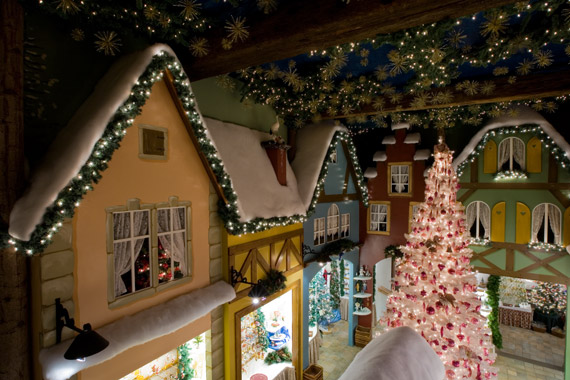 Sur plus de 300 m2, le lieu reconstitue un marché de Noël, avec ses petites maisons sous la neige… Le long d’un circuit (qu’on a envie de refaire plusieurs fois !), on trouve des décorations dorées, argentées ou colorées, des cristaux, des sujets en étain, en paille, en bois sculpté, des crèches, des illuminations et, pour finir, un espace consacré à l’art de la table, avec napperons, bougeoirs… Il y en a pour tous les styles de sapins !