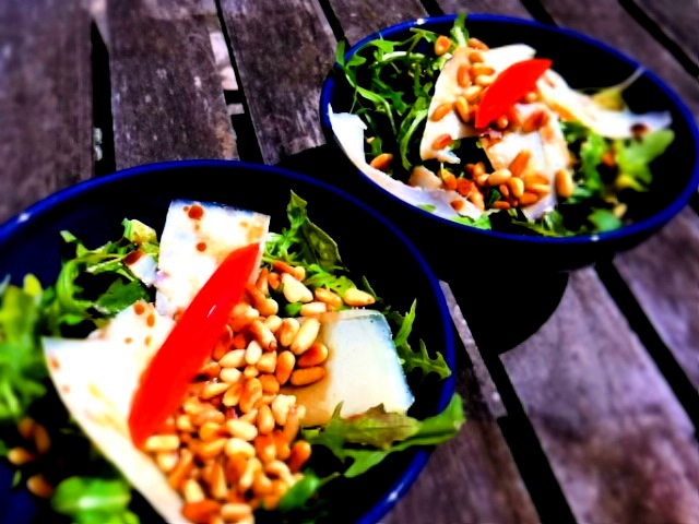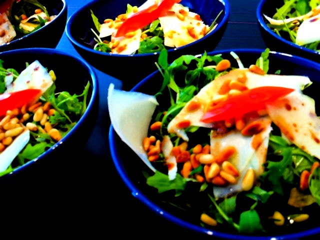 Pour cette entrée simplissime, nous avons opté pour la roquette, huile d’olive et vinaigre balsamique, pignons de pin torréfiés et copeaux de parmesan. Ajoutez un bouquet de basilic et une lamelle de tomate et buon appetito a tutti !