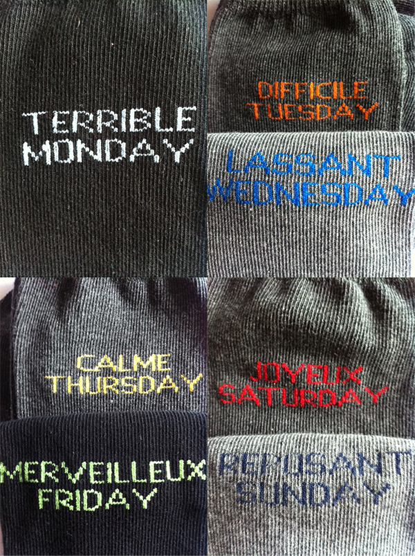Repérées dans une chaîne de magasins de chaussures, ces chaussettes savent déjà ce que nous réserve la semaine : un lundi terrible, un mardi difficile, un mercredi lassant, un jeudi calme, un merveilleux vendredi, un joyeux samedi et un dimanche reposant !
