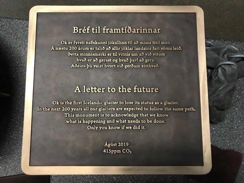 On peut y lire, à destination des générations futures : « Une lettre pour l’avenir. Ce monument atteste que nous savons ce qui se passe et ce qui doit être fait. Vous seuls savez si nous l’avons fait ». Elle indique également « 415 ppm CO2« , le niveau record de concentration de CO2 dans l’atmosphère enregistré en mai dernier.
