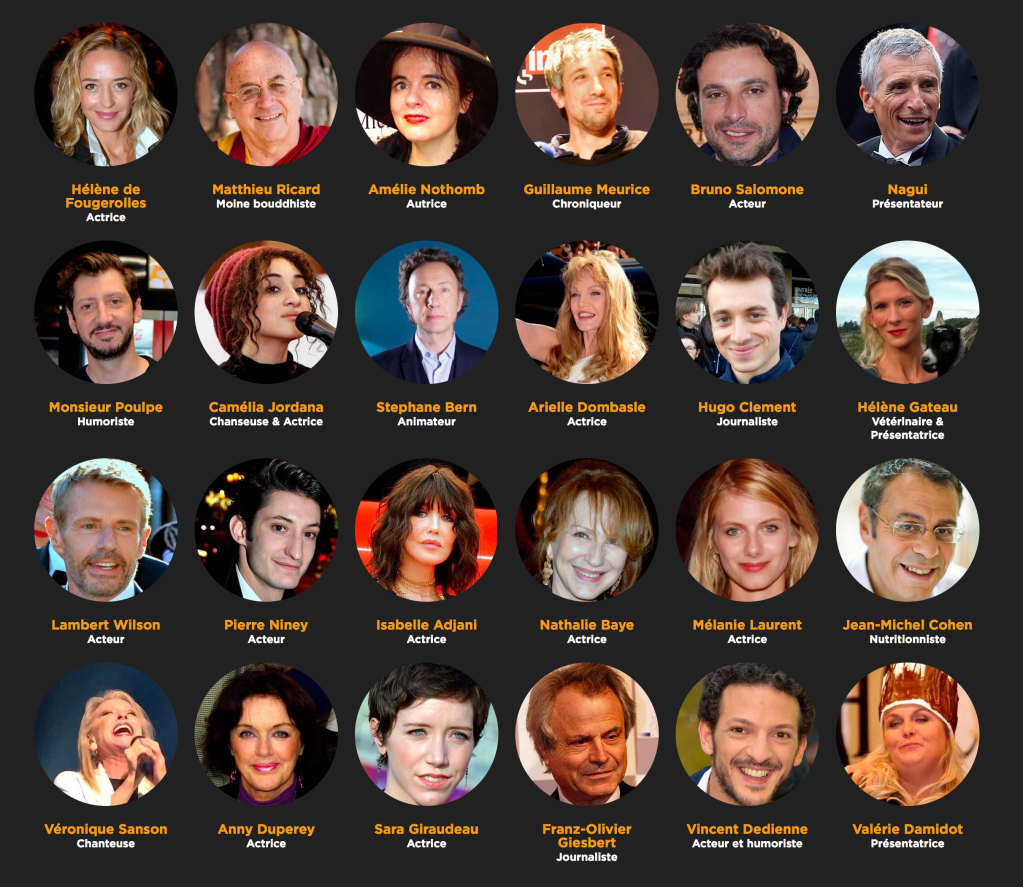 Ils sont acteurs (Isabelle Adjani, Nathalie Baye, Pierre Niney, Mélanie Laurent, Lambert Wilson, Hélène de Fougerolles …), chanteurs (Nicola Sirkis, Camélia Jordana, Véronique Sanson…), animateurs (Nagui, Stéphane Bern…), écrivains et philosophes (Amélie Nothomb, Frédéric Lenoir, Matthieu Ricard…), mais aussi scientifiques, universitaires, médecins et entreprises…