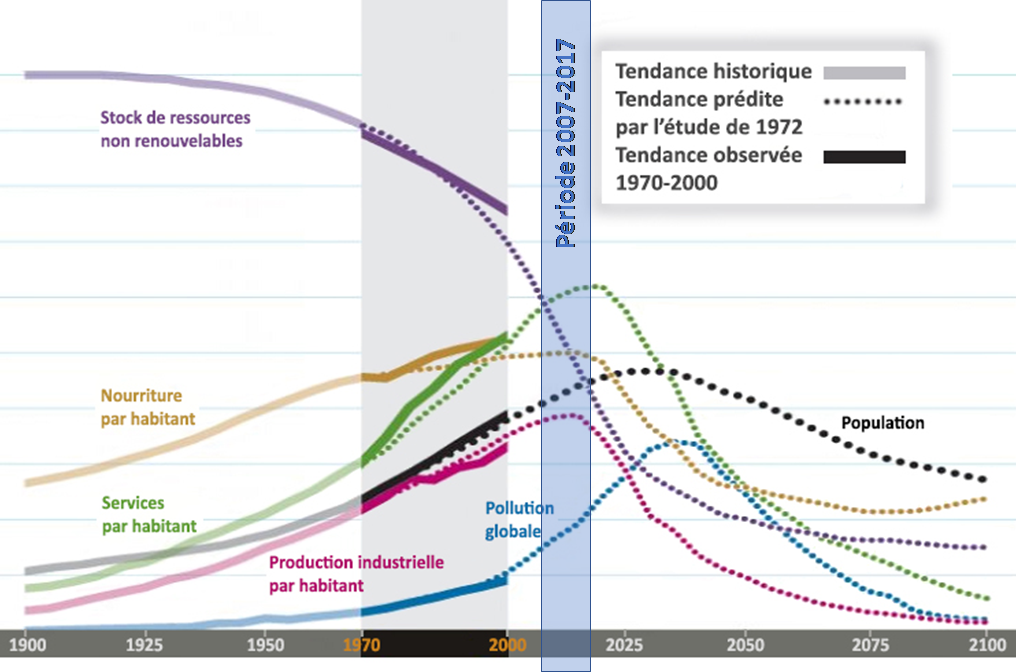En 1970, à la demande du Club de Rome (un groupe de réflexion international), des chercheurs du MIT planchent sur un modèle capable de « prédire » l’évolution du monde. Pour cela, ils sélectionnent 6 paramètres principaux (population, production industrielle, production de services, nourriture, niveau de pollution et ressources non renouvelables), entrent les données réelles de 1970 et créent plusieurs scénarios (selon que l’activité humaine est plus ou moins sobre, par exemple).