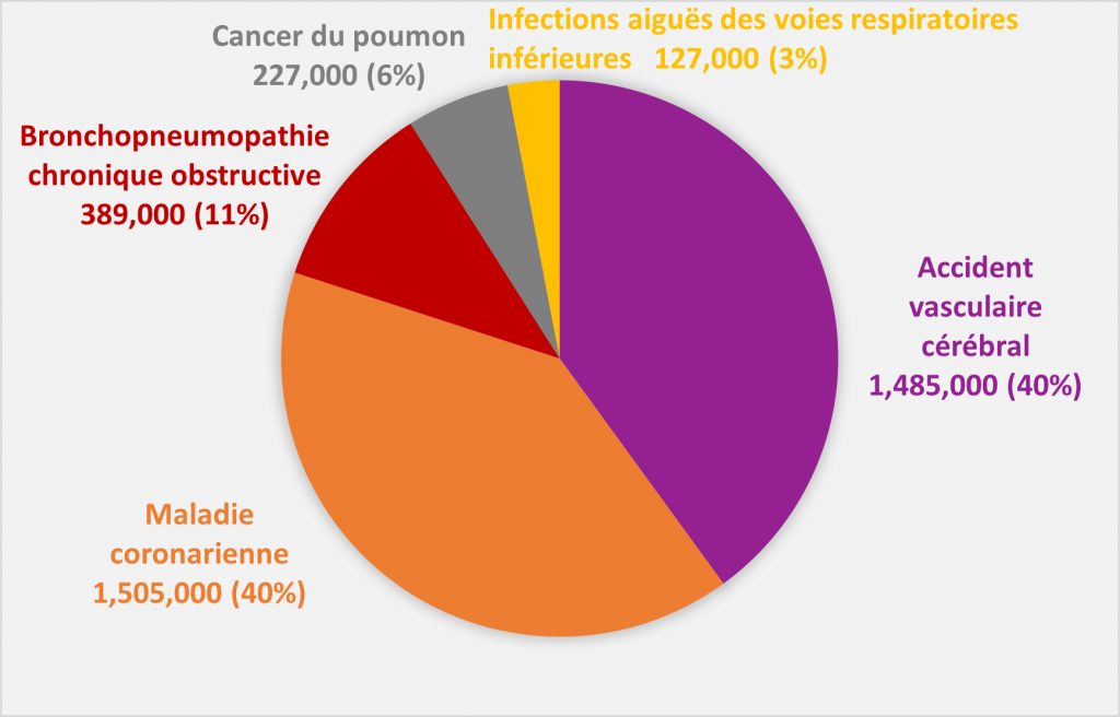 Toujours selon l’étude, la pollution de l’air tuerait 19 fois plus de personnes chaque année que le paludisme, neuf fois plus que le VIH/sida, et près de trois fois plus que l’alcool. Parmi les 8,8 millions de décès imputables à la pollution atmosphérique, 5,5 millions seraient évitables, notamment en remplaçant les combustibles fossiles par des énergies renouvelables propres (ce qui, en plus, réduirait le réchauffement climatique).