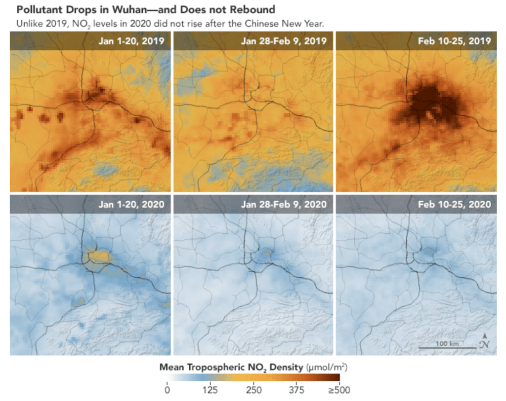 La Chine a été la première à ordonner le confinement d’une partie de sa population, ce qui a entraîné un arrêt de l’activité industrielle et économique. On a vu très rapidement les effets positifs de ce dispositif en termes de rejets de dioxyde d’azote, comme le montrent ces deux schémas.