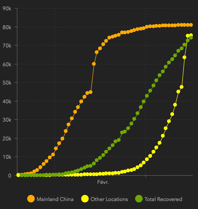 Selon toute probabilité, dans quelques jours, le nombre de cas hors Chine va dépasser le nombre de Chinois testés positifs au COVID-19 (environ 81 000 à ce jour), comme le montrent ces courbes.